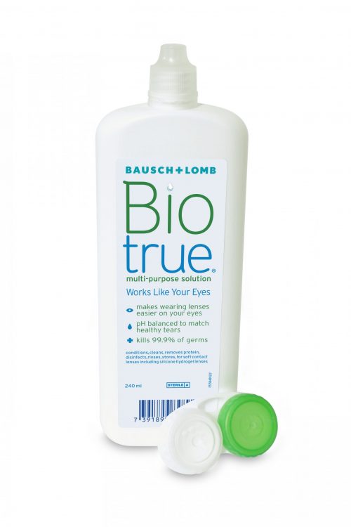 Biotrue Multi-Purpose Solution from pioneers Bausch & Lomb has manufactured this cleaner for soft contact lenses. It works like the eye to help make wearing contact lenses easier, no matter what lens brand you wear. Biotrue Multi-Purpose Solution moistens by using a natural lubricant found in the eye and it is pH balanced to match healthy tears enhancing the wearing experience for longer hours.